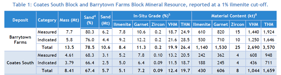 ‘Measured’ and ‘Indicated’ mineral resources of 10.6 million tonnes (Mt) at 19.9% valuable heavy minerals (VHM) at Barrytown Farms, and 5.7 Mt at 12.4% VHM at Coates South.